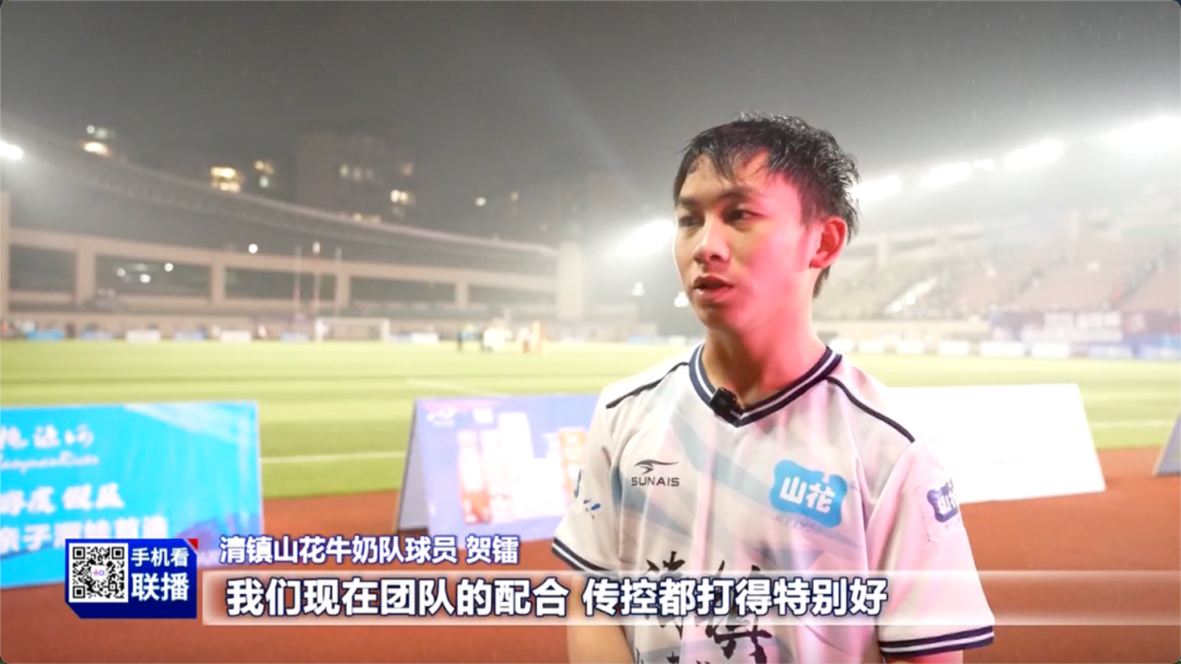清镇山花牛奶队球员 贺镭:对于我们团队来说,现在团队的配合、传控都打得特别好,比以前好得太多了。今天这场比赛我进了3个球,希望接下来的比赛我们全力以赴,再接再厉,争取在这次城超选拔比赛中拿到一个好的成绩。